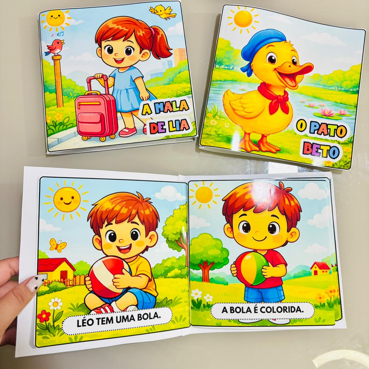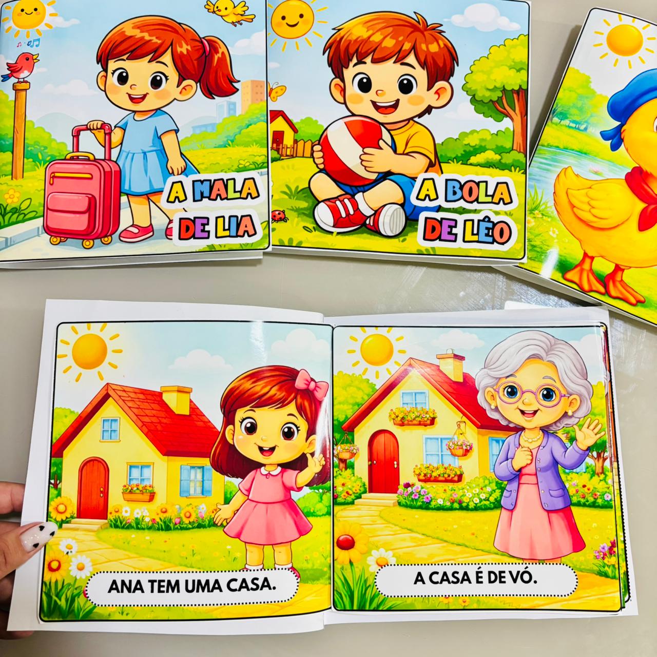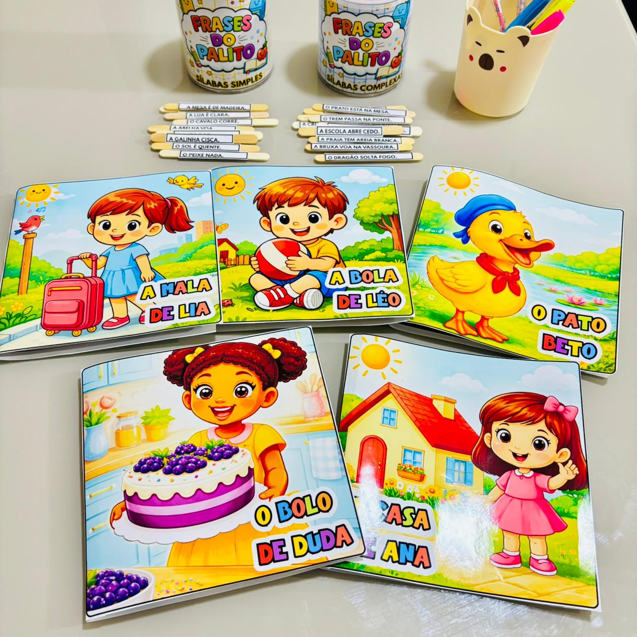 São 5 livrinhos infantis com palavras de sílabas simples, com uma frase por página — ideal para facilitar a leitura de forma leve e divertida.